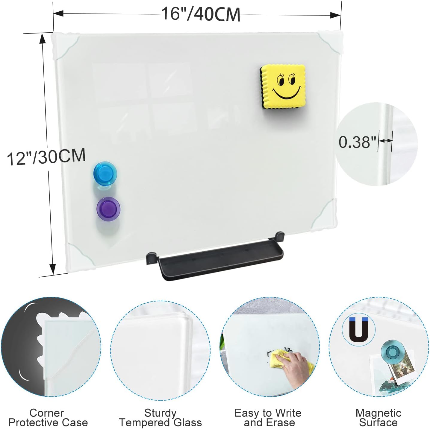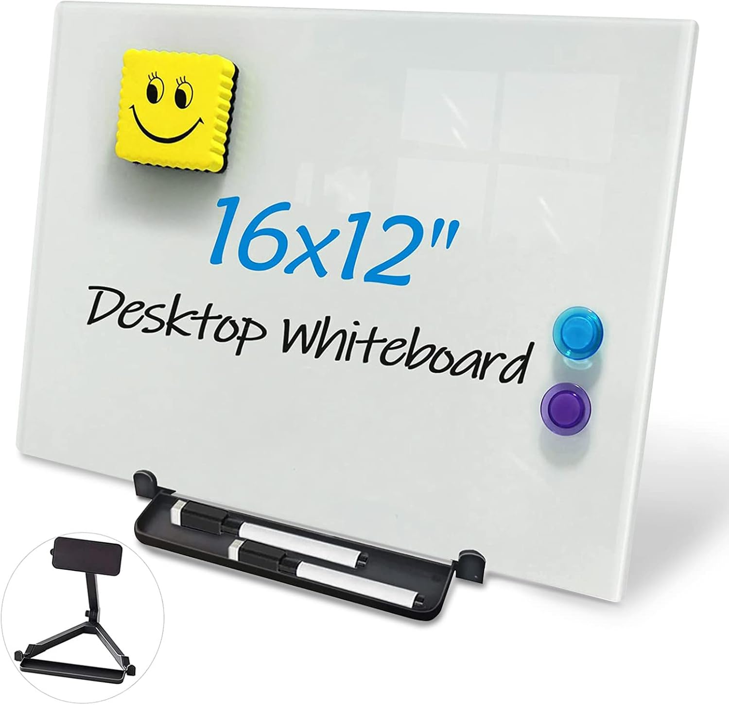 - VERSATILE GLASS BOARD - Keep your notes and reminders within reach, Perfect size (16"x12") designed to fit your desk space; It’s small enough for your desk but large enough to complete your plan in one go. Lay the board flat for comfortable writing or prop it upright for high visibility, SAVE PAPER with this dry erase glass board