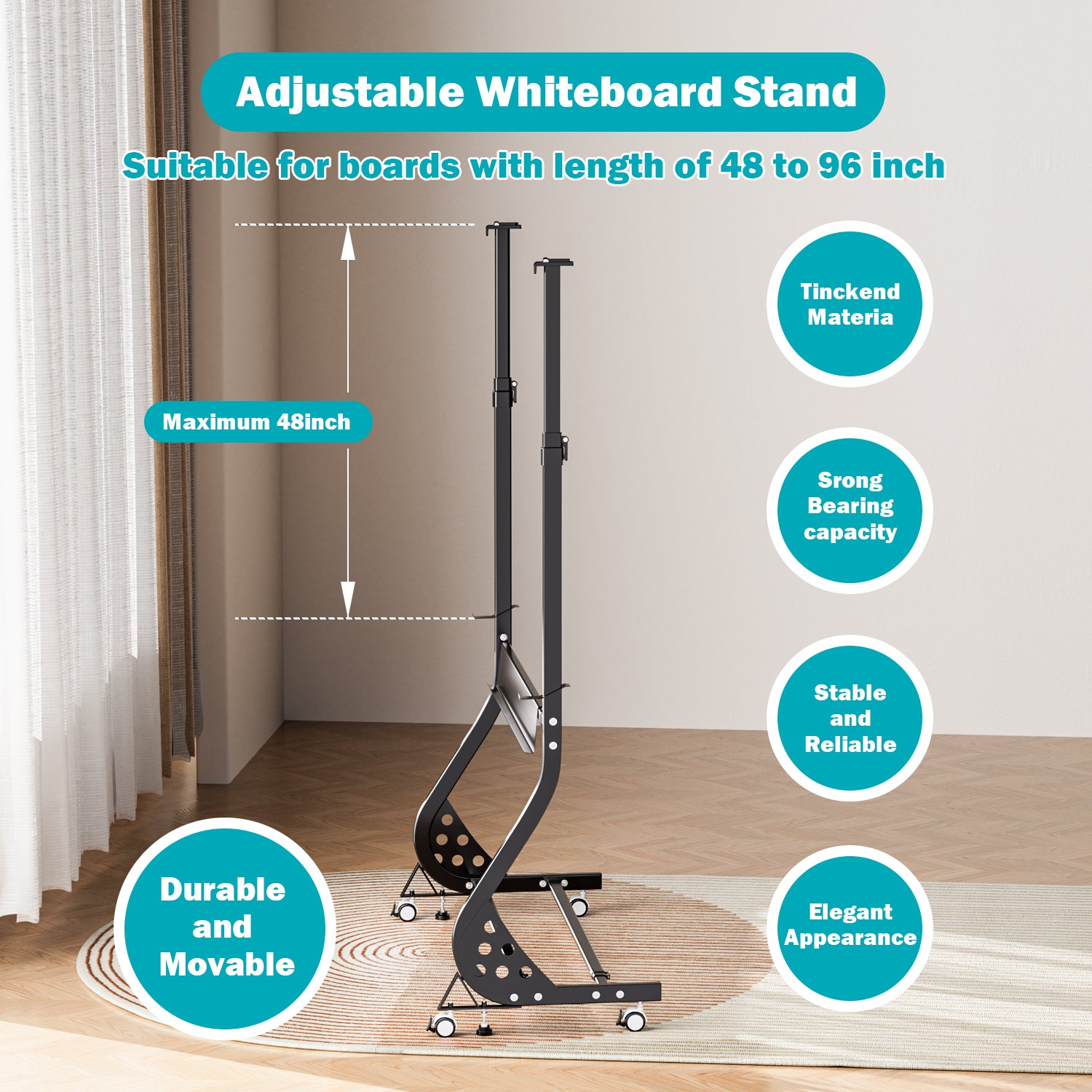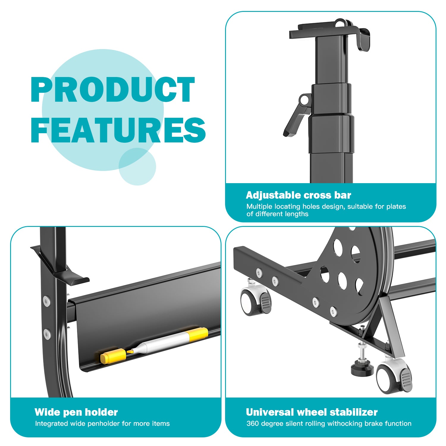 This stand is both sturdy and versatile. It can hold different types of boards, and the adjustable features make it very useful. The stand is made of solid aluminum, and the silver finish gives it a professional look. The wheels with locks are a great addition, allowing for easy movement and stability. Assembly was straightforward, and it's been a great product for my office. I'm very satisfied with it.