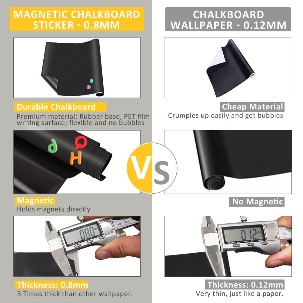- 【THICK REAL CHALKBOARD STICKER】- Unlike traditional thin chalkboard paper, our chalkboard sticker is very thick, which is 3 times thicker than traditional wallpaper, it's made of premium-quality PVC film and thick rubber layer, super durable, Thick materials will greatly enhance your writing experience, it's also flexible and cuttable with knife or scissors; Warm Note: The matte surface is the writing surface