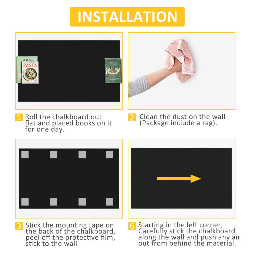 ✔ The chalk on the board is best to be wiped off by a damp cleaning cloth(Will be provided) and wait until the entire surface is dry before adhering your chalkboard liner.