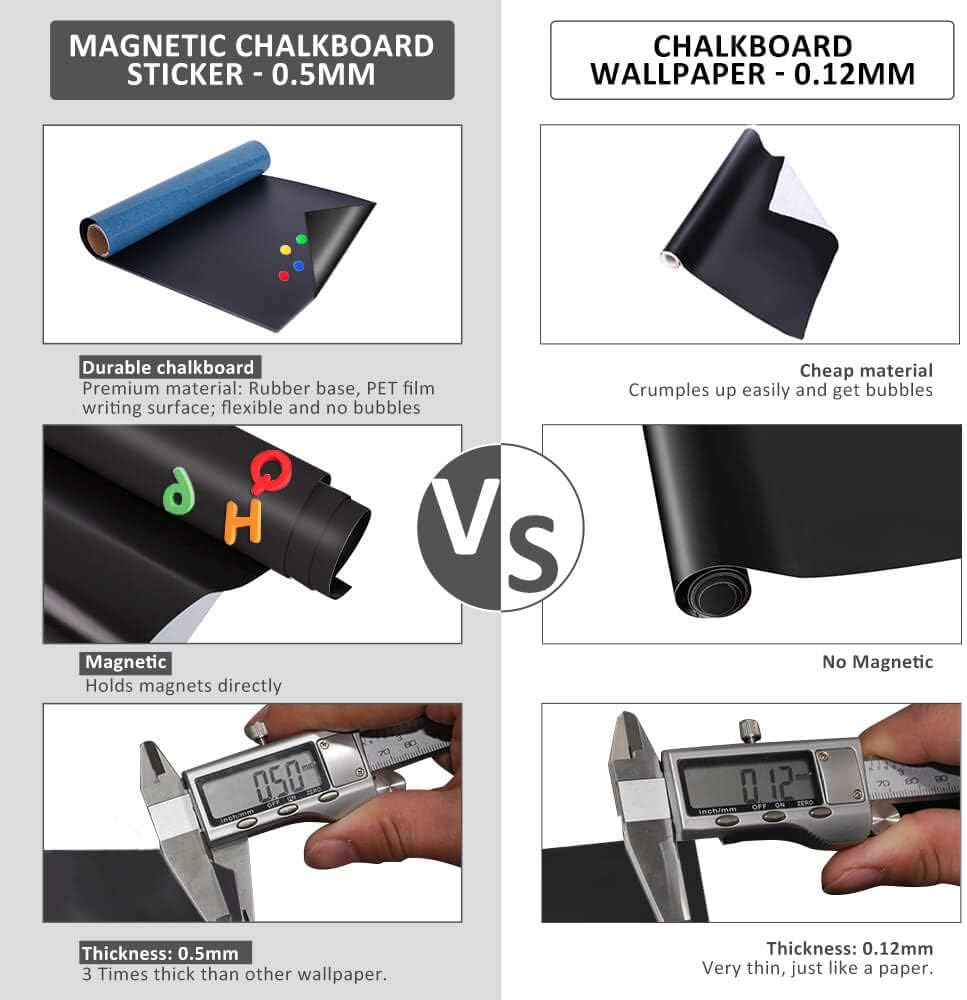 - 【REAL CHALKBOARD STICKER - 0.50MM】- Thickness: 0.50mm, the thickest chalkboard sticker on Amazon, not paper or decal, 3 times thicker than other(0.16mm) chalkboard wallpaper, durable and waterproof, give you a real chalkboard writing experience; Warm Note: The matte surface is the writing surface